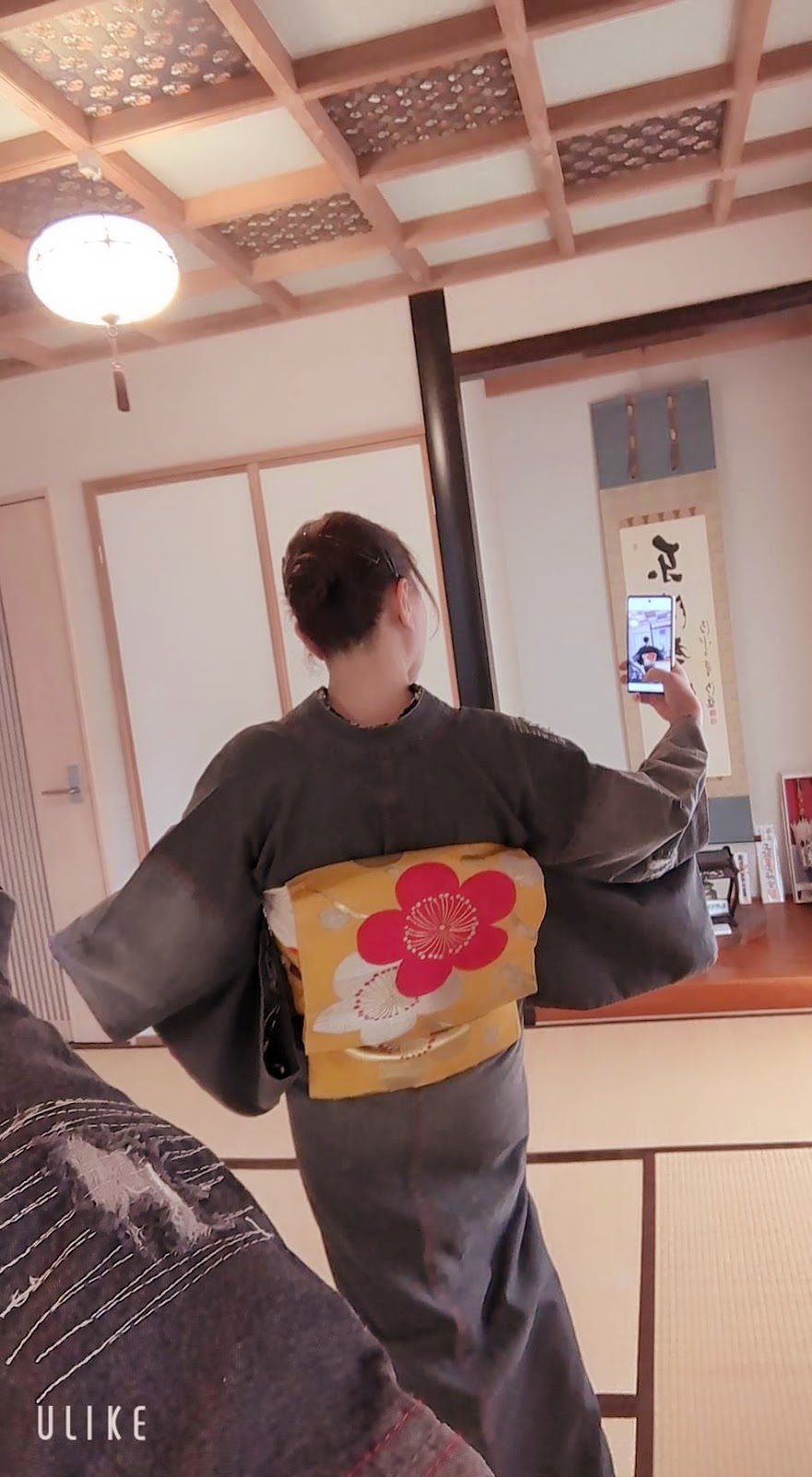 今回の着物コーディネートは、そんな季節にぴったりな「デニム着物 × アンティークの梅柄の名古屋帯」を組み合わせてみました。広島県廿日市市のご自宅へ出張着付けに伺いました。